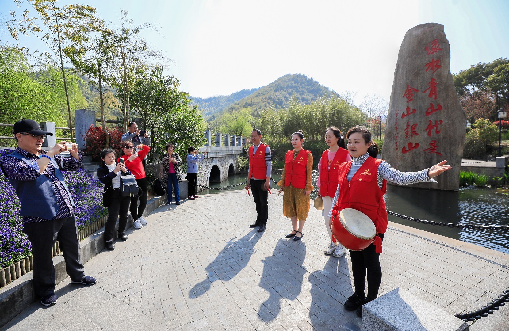 湖州市安吉县天荒坪镇余村党支部成员组成的“党史宣讲团”用“三句半”的形式为游客讲述余村的故事