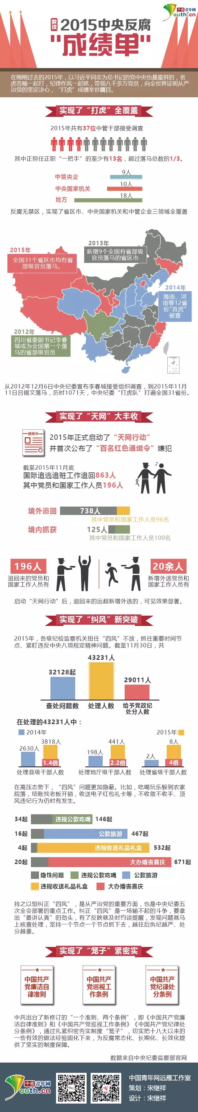 2015年,全国共立案33万件,处分33.6万人,涉嫌犯罪被移送司法机关处理1.4万人。涉嫌违纪的中管干部结案处理和正在立案审查的90人,其中涉嫌犯罪被移送司法机关处理42人。十八大以来查处的中管干部覆盖了31个省区市。狠抓国际追逃追赃,追回外逃人员1023人,属于“百名红通人员”的18人,首次实现追回人数超过新增外逃人数。