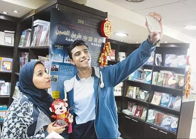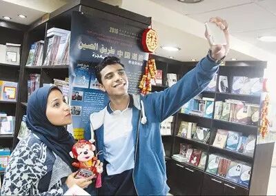 在埃及中国图书展销会现场,两位当地学生合影留念。人民日报记者 王云松摄