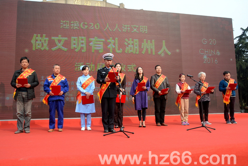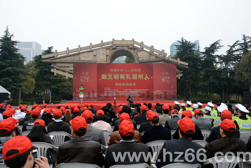 湖州在线讯 G20峰会今年9月将在杭州举行。为进一步提高公民文明素质,以良好的文明风尚迎接G20杭州峰会,扎实推进“文明创建攻坚年”活动,3月21日下午,“迎接G20 人人讲文明--做文明有礼湖州人”活动在湖城爱山广场举行,市委常委、宣传部长胡菁菁,副市长闵云出席启动仪式。