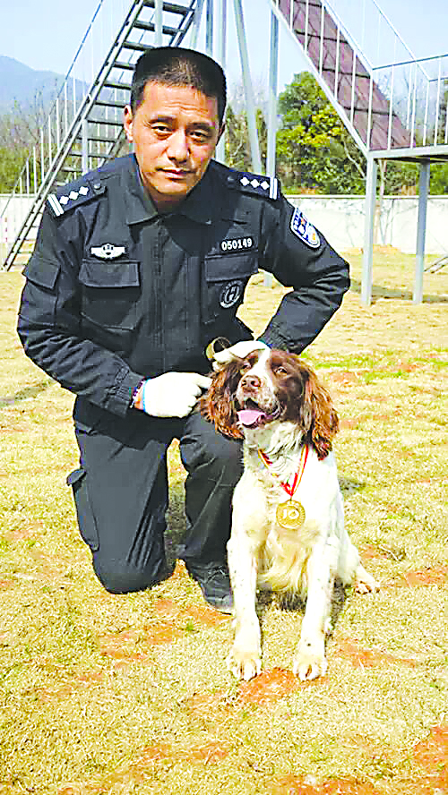 为了展示“小白”的本领,盛建在训练场上放了7个包裹,其中只有一个里面放了仿真炸药包,结果“小白”一下就找了出来。“‘小白’是条‘史宾格犬’,最大的本事就是搜爆,截至目前共参加过200多次安保任务。在前年的青奥会安保中还搜到过仿真炮弹一枚,被公安部评为功勋犬,在国家层面上为我们湖州公安争得了荣誉。”说起“小白”的“业绩”,盛建滔滔不绝,不吝赞美之词。