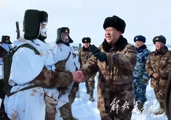 2014年1月26日,习近平来到祖国边疆的内蒙古阿尔山,冒着摄氏零下30多度的严寒,迎风踏雪慰问在边防线上巡逻执勤的官兵。