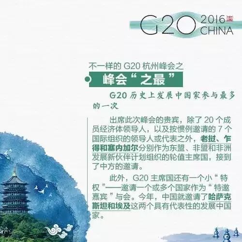 中方邀请的嘉宾国包括非洲联盟的轮值主席国乍得,非洲发展新伙伴计划主席国塞内加尔,东南亚国家联盟轮值主席国老挝, 77国集国轮值主席国泰国,以及发展中国家的代表埃及与哈萨克斯坦等。杭州峰会创造了G20历史上发展中国家能见度最高的记录。这大大拉近了G20与广大发展中国家的距离,展现了此次峰会的开放与包容。