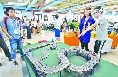 受G20杭州峰会主办方邀请,来自世界各地的记者在杭州互联网梦想小镇采访。图为一家创新科技公司工作人员在展示产品。新华社发