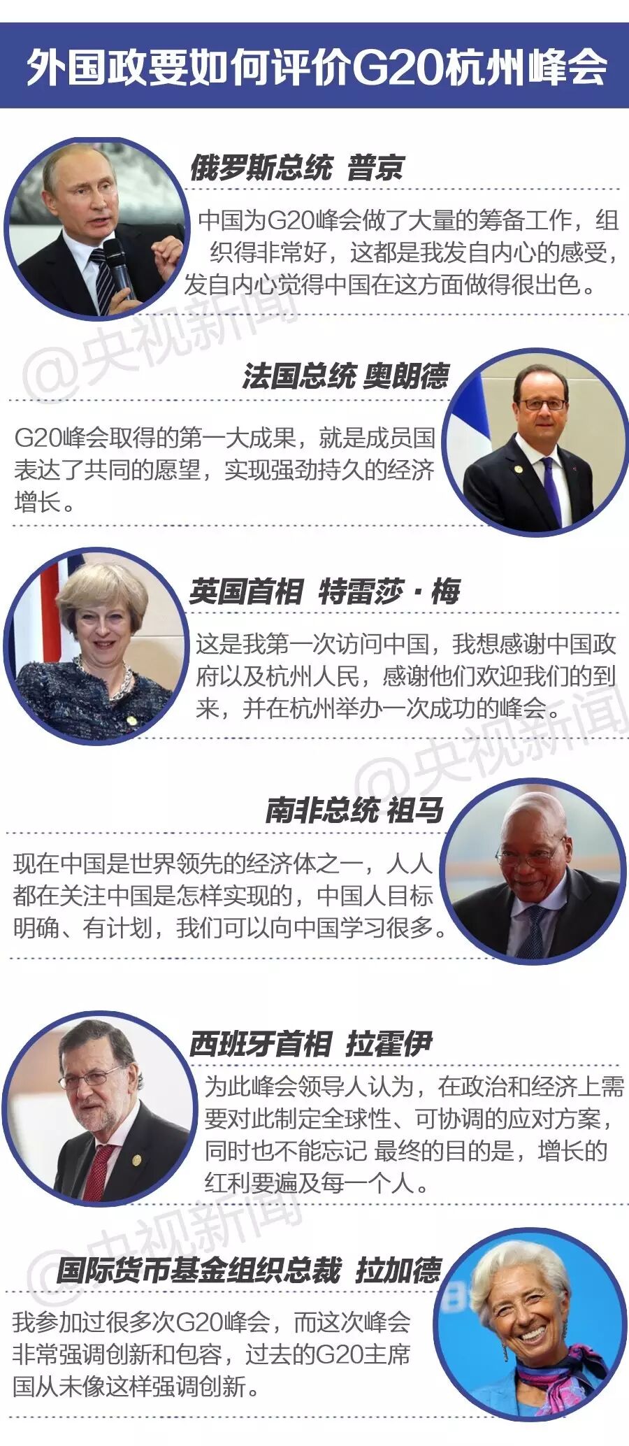 各方高度赞扬杭州峰会的共识,感谢中国举办会议的付出。一些与会领导人还肯定了中国的发展成就以及中国经济发展对全球经济的影响,明确表示愿与中国加强合作的意愿。杭州峰会使G20进入升级版,使中国成为G20中举足轻重的角色。