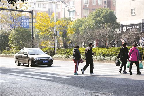 昨天,望湖农贸市场附近的斑马线前,不少车辆都主动停下来,礼让行人。
