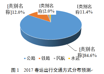 一是从客流规模来看,客运量保持小幅增长态势,预计2017年春运期间,全国旅客发送量将达到29.78亿人次,同比增长2.2%。其中,铁路、民航客运量增长较快,均达到10%左右。春运旅客出行方式中,铁路、公路、水路、民航客流量占比分别为12.0%、84.6%、1.4%和2.0%。铁路与公路仍是春运出行的主要方式。