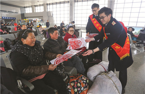 在高铁湖州站,车站工作人员近日向旅客赠送精心设计的剪纸窗花,并送去节日祝福。