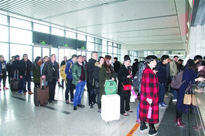 2月16日,在湖州高铁站售票大厅,售票窗口前旅客排起了小长队。据介绍,最近几天返程旅客不多,出城却迎来一波小高潮,主要为外地高校就学的学生流、昆明北京重庆等方向旅游的旅客流以及一些外出工作人员,平均每天大约七八千人次。