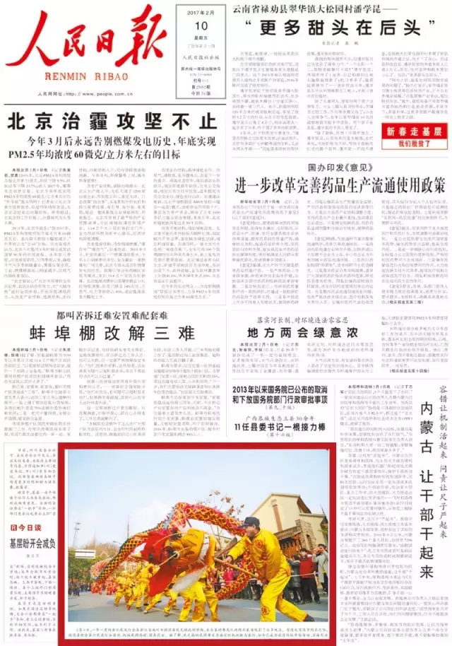 2月10日的《人民日报》头版以单幅大图形式报道了湖州德清的浙北乾龙灯会。原文如下: