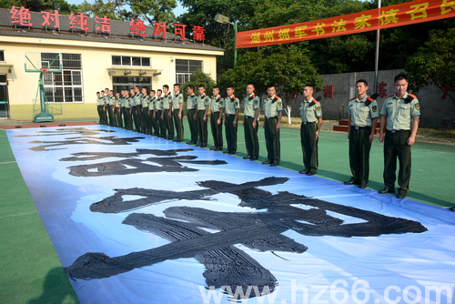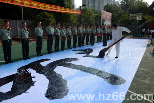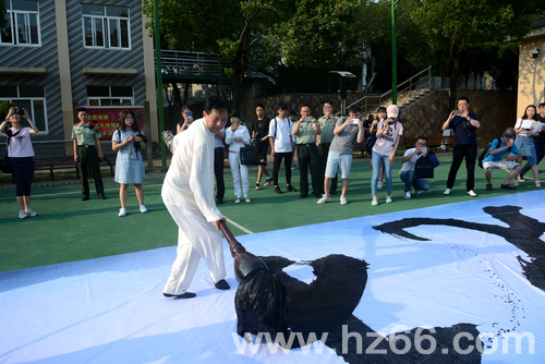 随后在湖州武警支队,巨笔书法家慎召民送书法进军营活动正在这里举行。慎召民用一支巨大的毛笔,在50余平米的画布上写下了“听党指挥”四个大字,送给武警支队的官兵们,勉励他们听党指挥、能打胜仗。记者们在现场不断用镜头记录着这一激动人心的时刻,把湖州人民对官兵们的深情厚谊深深刻印在脑海中。