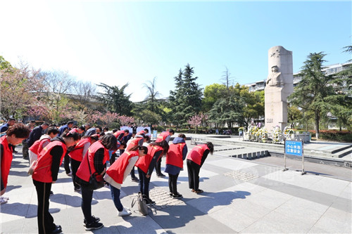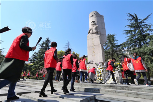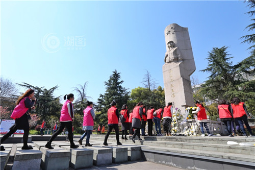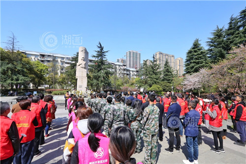 2019年4月1日,是“海空卫士”王伟牺牲的十八周年。当天,全市各界人士纷纷自发前往位于吴兴区凤凰公园王伟烈士塑像纪念碑前开展祭奠活动。图为开发区凤凰街道组织团委、工会、民兵志愿者百余人在王伟烈士塑像纪念碑前致敬英雄缅怀先烈。