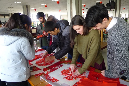 剪窗花、写福字、编中国结……2017年春节前夕,湖州师范学院内来自俄罗斯、乌克兰、哈萨克斯坦等39个国家的445名留学生共聚一堂,共迎他们眼中的“洋节”。