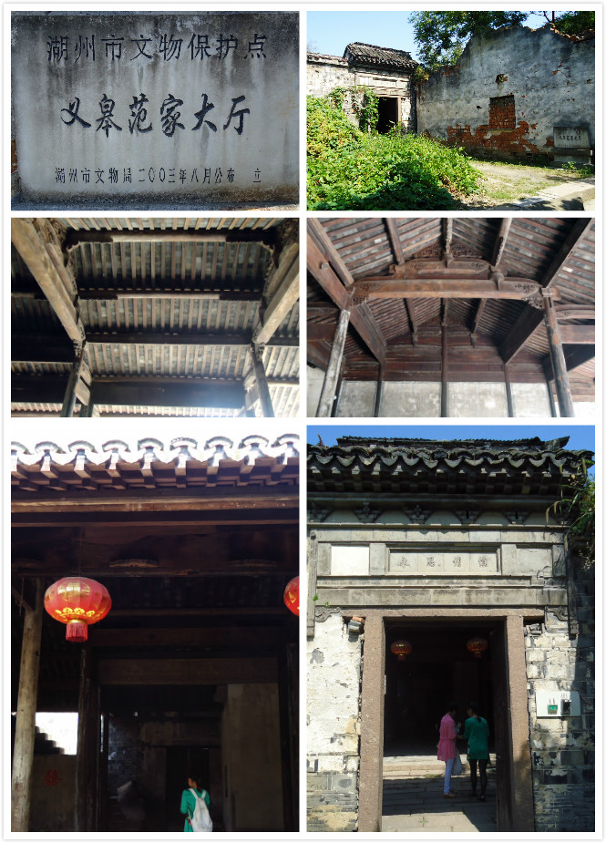 看完桥后自然往东走,一座古厅屋吸引了我,门口竖有“湖州市文物保护点义皋范家大厅湖州市文物局二00三年公布立”的石碑。大厅坐北朝南,共3进,由砖雕仪门、天井、大厅和两进楼屋组成。大厅面阔3间。砖雕仪门正面刻有“型仁讲让”,背面刻有“慎修思承”。大厅梁架为抬梁式,内四界单步后双步,悬山顶,方砖铺地,体量较大,木构雕刻精美,据专家判断应属清代建筑。