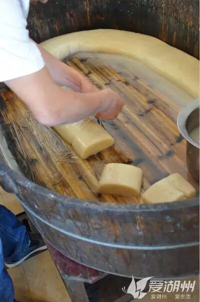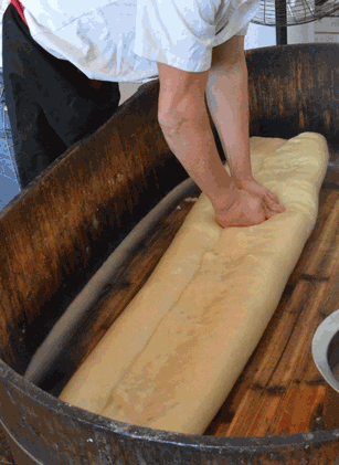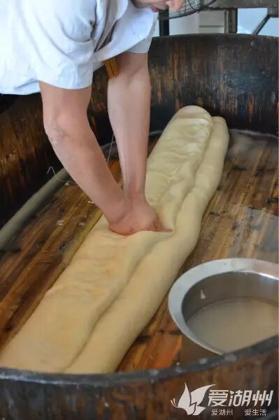 用来制作年糕的糯米粉,蒸透之后就可以开始制作年糕了。刚出锅的米粉特别烫,但必须乘着这股子烫劲下手不停的揉,师傅说要不断摊开和回笼9个回合,是非常耗费体力的一个关键步骤。