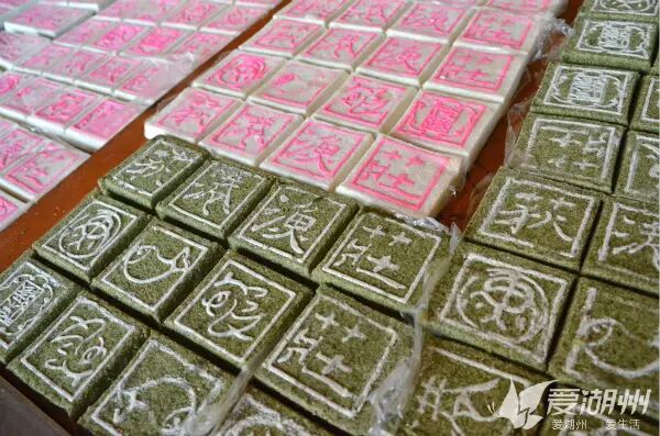 这是我们儿时的记忆,每次家里摆酒席的时候都会用到松糕。这里卖的比较好的要数这墨绿色的家伙了。询问了糕点师傅才知,这是因为加入了桑叶的缘故。