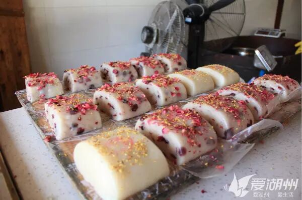 分切年糕用的工具是一根棉线,师傅拿线左右交织这么一勒,一块年糕就出来了,最后盖上印章,撒上桂花,这颜值,这香味,足以让你沉醉。除了桂花口味,还有玫瑰口味、红糖口味的年糕,总有一款会是你所爱的!