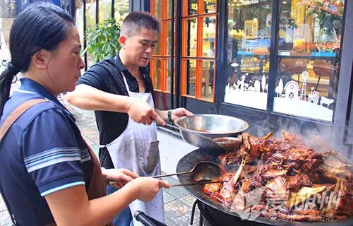 刚刚出锅的羊肉,还冒着腾腾的热气,老板两口子一人拿着一个勺就在店铺忙开了…… 据小爱所知,在销售旺季,就这样的大锅羊肉,他们家一天能卖出3~4锅呢! 这诱人的色泽和扑鼻的香气,小爱我实在是难以抑制住体内的馋嘴之力啊! 红烧羊头