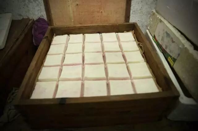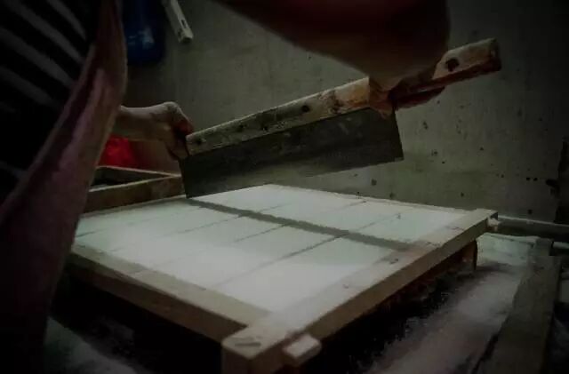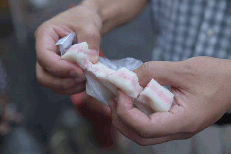 顾老板告诉小爱,因为糕点店除了薄荷糕以外还会制作松糕、肉糕(新市茶糕)、青圆(甜/咸)、萝卜丝圆子、刺毛圆子等,所以一般凌晨一两点就必须起床准备,并且因为与很多酒店都有合作的关系,糕点店常年都很忙,几乎没有休息时间。而夏季的到来,顾老板还需要另加准备有关薄荷糕的材料。 老板说,薄荷糕其实就是用糯米粉和粳米粉混合加入,而顾老板则把这种糯米粉与梗米粉的混合后分成了两批。其中一批米粉用传统食物染色方式将其变成了粉色,并加入了提前配置好的秘密武器 -- 薄荷。之后取大笼并垫上湿布,用专有的木质方框圈起倒入第一层米粉在粉色米粉之上再倒入一层米粉之后,作坊的阿姨用特殊的切刀,熟练地将这一大块未成形的薄荷糕切成了25份 之后,阿姨将方框拆除与其他的笼屉架在一起后,由老板将这些笼屉一同置于旺火上蒸20分钟。 薄荷糕虽美味,但人家顾老板说了每天准备的薄荷糕只有四笼。许多人都天微微亮,就来到铺子前排队买糕喽! 据说,很多时候不到八九点,薄荷糕就已经卖空!可见在炎炎夏日里,这薄荷糕的魅力可不容小觑哦~