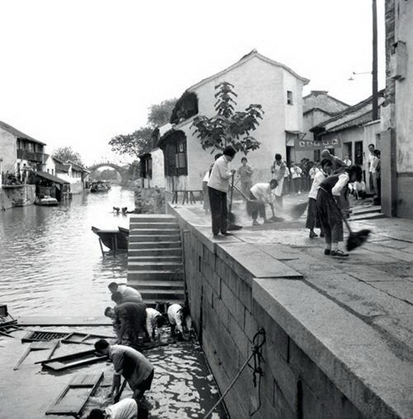 南浔镇傍水依街的某处街景,主体是一群人在路上打扫卫生,还有人在河里洗刷门窗……日前友人给我看了这幅摄于1957年水乡古镇原生态的老照片,瞬间吸引了我的眼球。这可是表现60年前南浔《万人大镇无苍蝇》的图片之一。