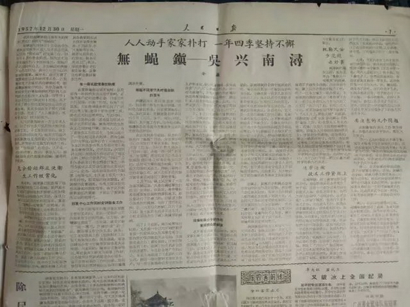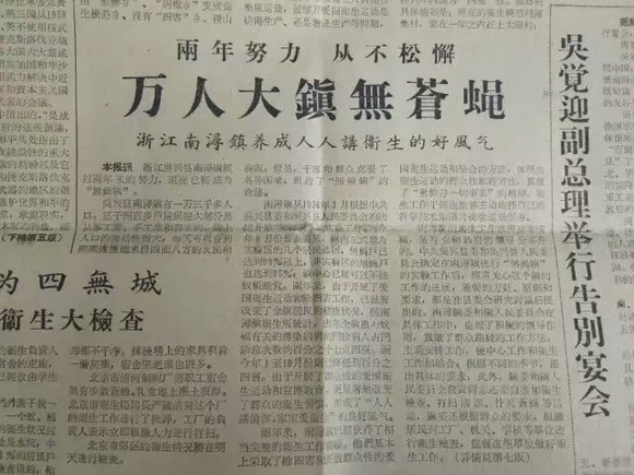这故事我听说过,遥想当年,南浔市民为了让生活更美好,开展了群众性爱国卫生运动和宣传教育,形成了人人讲清洁、家家爱卫生的良好风气,争创了“无蝇镇”。 1957年12月27日,《浙江日报》对此作了详尽报道;同年12月30日,《人民日报》以《万人大镇无苍蝇》为题作了报道,并刊登了《人人动手家家扑打,一年四季坚持不懈,无蝇镇——吴兴南浔》的经验介绍。“今天政府一再要求‘五水共治’,还有剿灭劣V类水,跟60年前的号召差不多,都是为了我们老百姓生活得健健康康的。”老者说。“你看,现在这条河多少干净啊,跟我年轻时候看到、用到的差不多。”老者的话语无不体现着当年“无蝇镇”“卫生镇”的创建风范,更多的是表达了普通人向往健康美好生活的愿景。