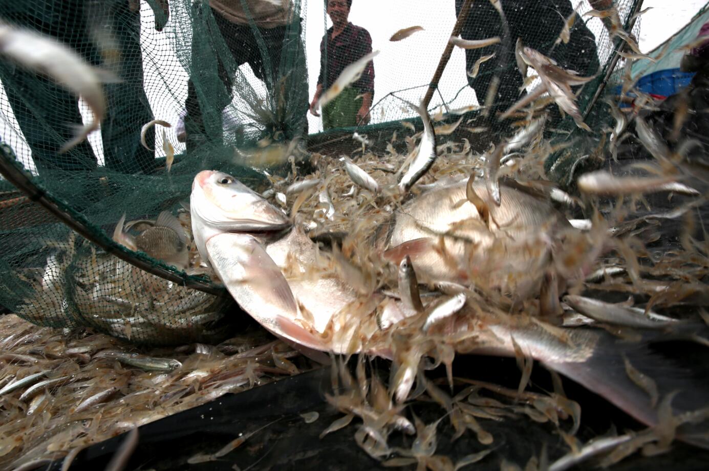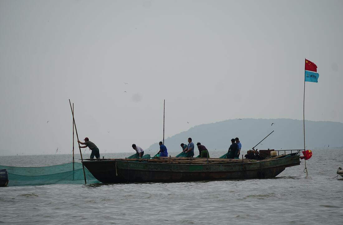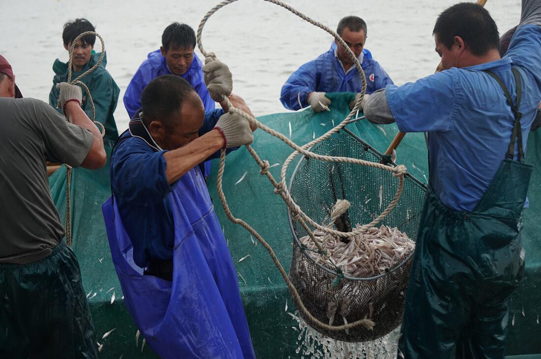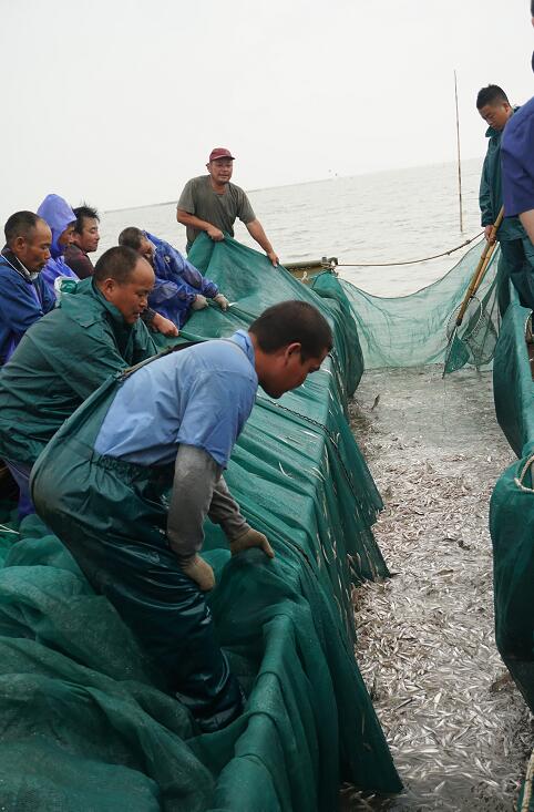 昨日下午2时许,伴随着一声声强壮有力的吆喝声,高踏网起网了,只见10多名身着蓝色防水服的渔民们卖力地将高踏网用力往上拉,收网、分拣,一片热火朝天的景象。数不清的梅鲚鱼、白虾等在网中活蹦乱跳,不时还有硕大的鲢鱼跃出水面。这一网,至少能有4万斤左右吧,随着渔网被拉到大船边,渔民们又忙开了。他们各自分工,有的在把网当中的鱼捞到船上,有的把鱼初步分类。不一会儿,大船的船舱已经装满了鱼。而在远处另一个捕捞点上,一网基本已经收拣完毕。船主望着鱼舱内满满的鲜活鱼儿,乐呵呵地说:“今年收成应该会比去年好,因为整个价格比去年高了,特别梅鲚鱼的价格,去年每斤只有0.4至0.5元,今年可卖到1元多,翻了一番不止呢。”