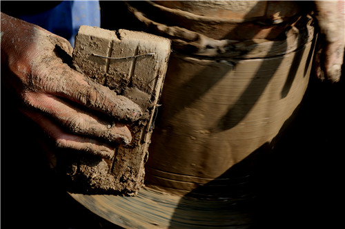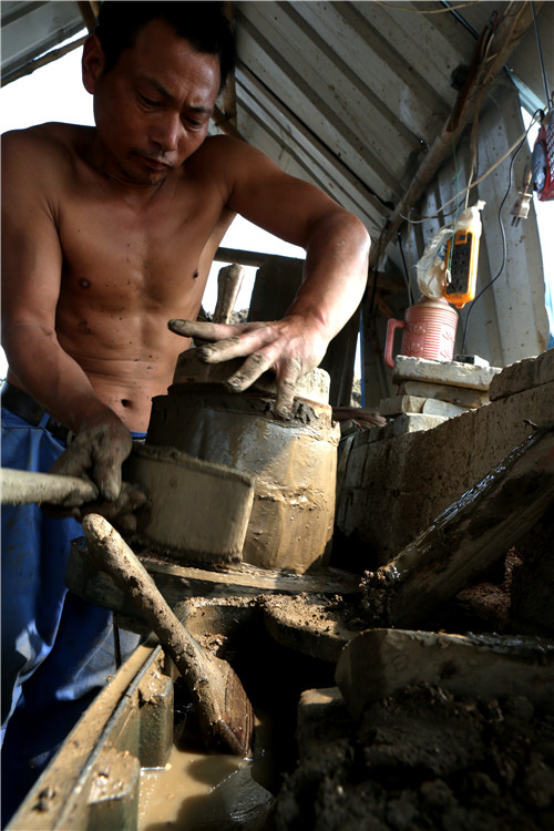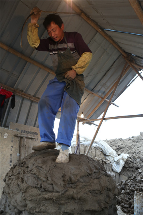 清晨5点不到,杨石就来到工棚,他首先要将和好的泥块堆成一人高的泥墩,然后踩好压实,这个泥墩足以够他干上半天的活。