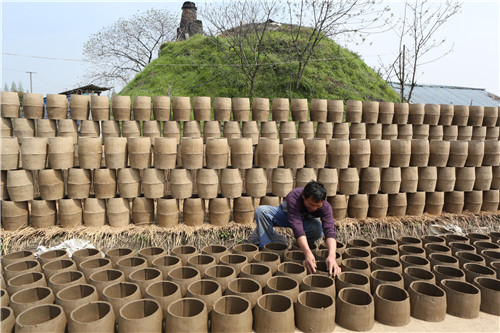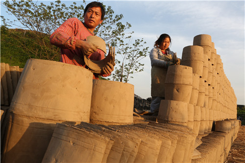 6、杨石夫妇将一只只晒干的瓦坯,拆成瓦片。