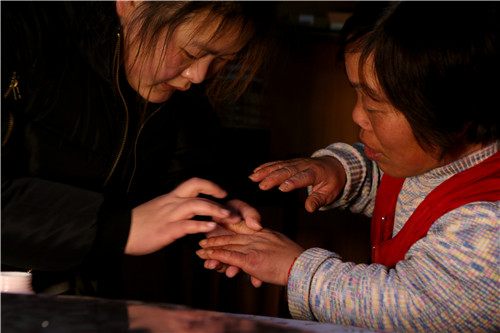 6、晚上回到家,女儿十分心疼地为她涂冻疮药膏。每年至少有3个月,陈张花的手脚长满冻疮。为了城市的整洁靓丽,她们付出了别人无法体味到的艰辛。