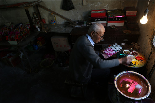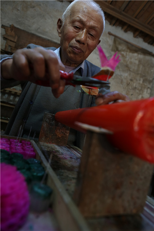 随着时代变迁,近几年龙凤花烛的制作,逐渐淡出了人们的视线。今年83岁的付根宝是镇上惟一还在操持这门手艺的老人。