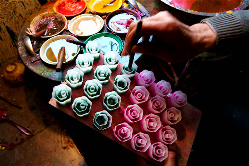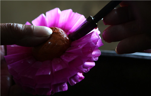 2、高温的蜡油遇到冰水瞬间从模具上脱落。一蘸一浸间,一朵朵色彩艳丽的蜡花便在付根宝手中呈现。