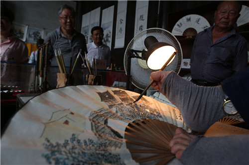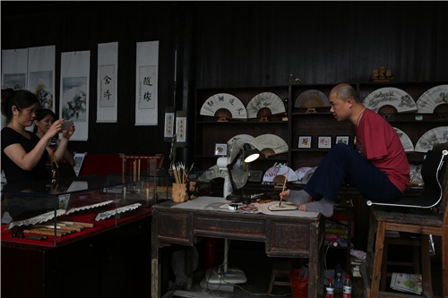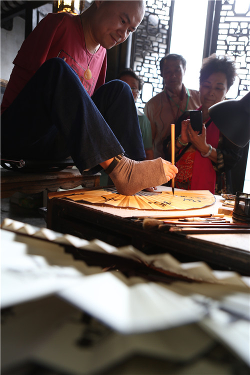 10、归晓峰以脚代手画扇面的场景,已成为南浔古镇游客眼里最亮丽的一道人文风景。