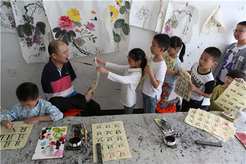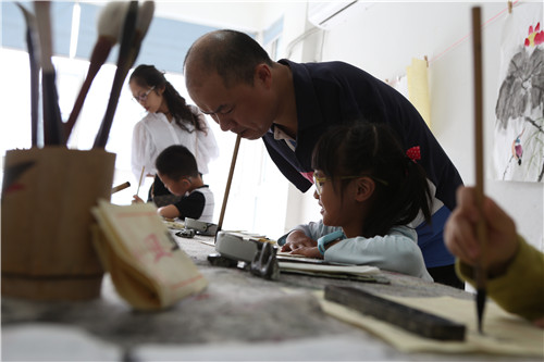 5、归晓峰以口含笔,悉心辅导书画辅导班的孩子练书法。