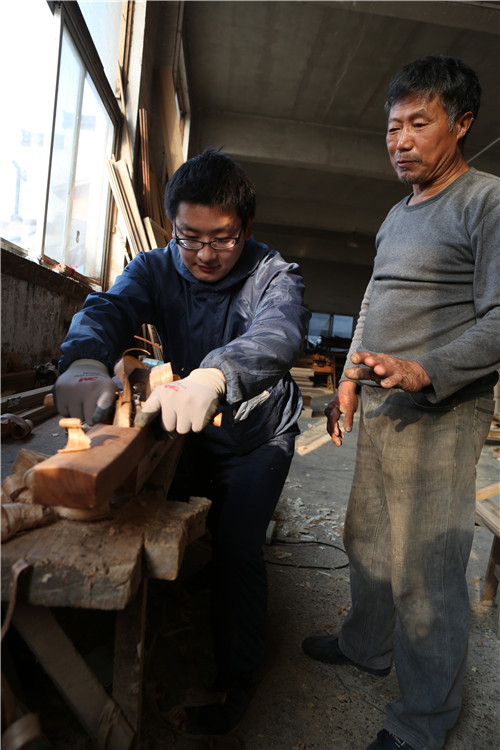 6、郭金贤正在指导新带的徒弟陈亮练习基本功。一凿一斧的制作工艺,与如今的流水生产线相比,显得尤为珍贵。