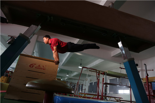 1、年已半百的黄拥军偶尔会在自己生产的体操器械上练一手,英姿不减当年。