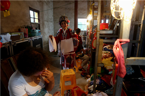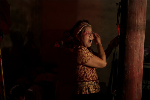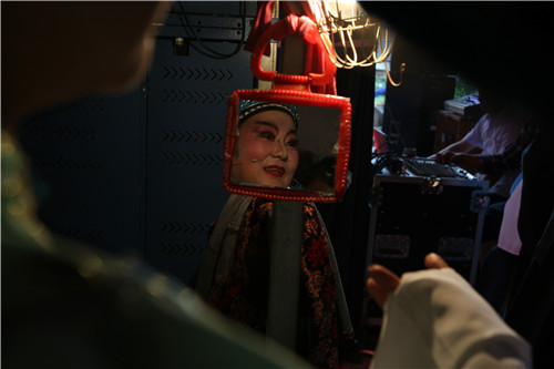 2曹金文正在后台扮相。剧团创办以来,她几乎场场不落。对于她来说,只要有戏演,就是最大的快乐。
