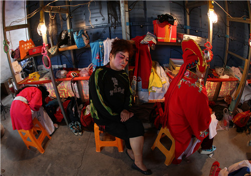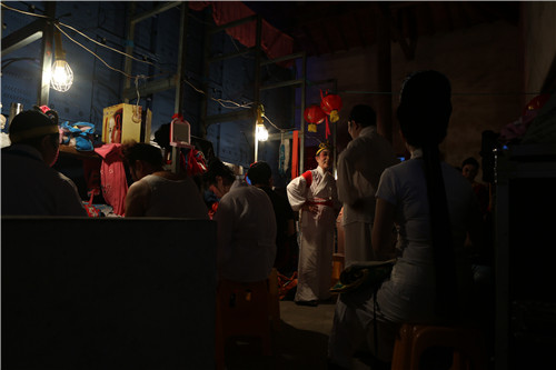 8、夜幕降临,正是戏班每天最庄敬的时刻,演员们各就各位,仿佛战士在冲锋前的状态。