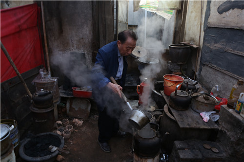 4、潘平福用煤炉烧水,每天要烧几十瓶开水供应给茶客。