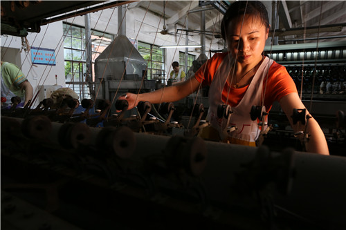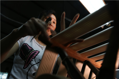 6、吕妹正在一台从上世纪80年代沿用至今的传统立缫机前进行小样试验。吕妹从1992年开始缫丝,是“全国丝绸工业技术能手”。