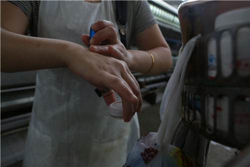 10、大部分女工的双手由于长时间浸泡在碱性的“缫丝汤”里,常患有手皮炎,每天要靠涂抹冰醋酸来防止溃烂。