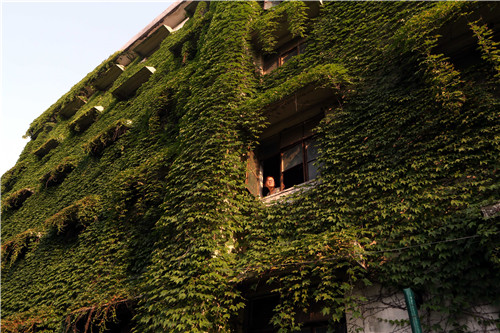 13、浙丝二厂一幢建于上世纪的宿舍楼,外墙已被爬山虎占领,犹如蚕桑行业的活化石。