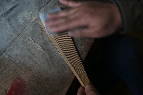 制一把扇子至少要一周以上。要经过切、刮、拖、倒、烘、打磨、雕刻、髹漆等36道大工序、108道小工序,每一道都要精益求精。