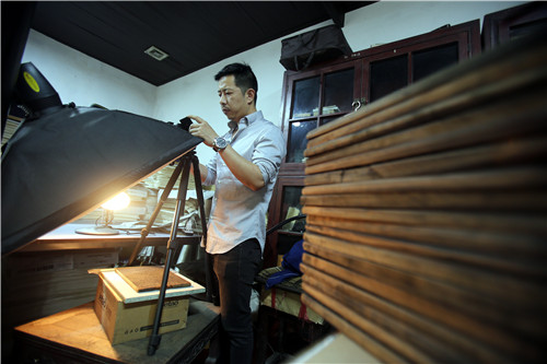 4、儿子郑宗南正在将一些雕版进行摄影保存。现在,每一片雕版都要制成电子档案。