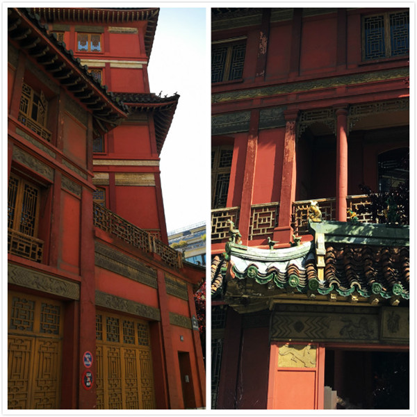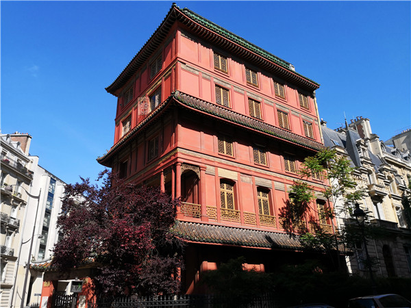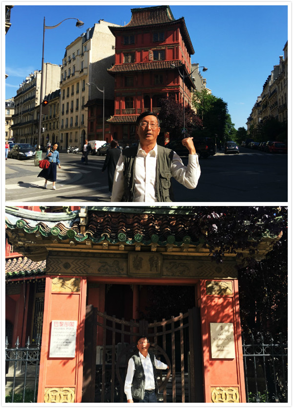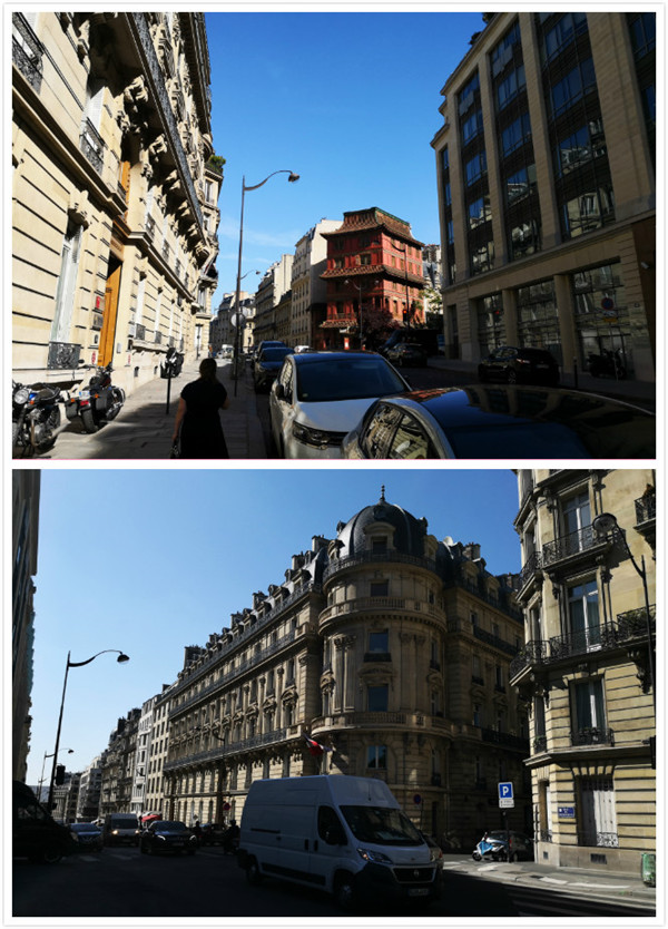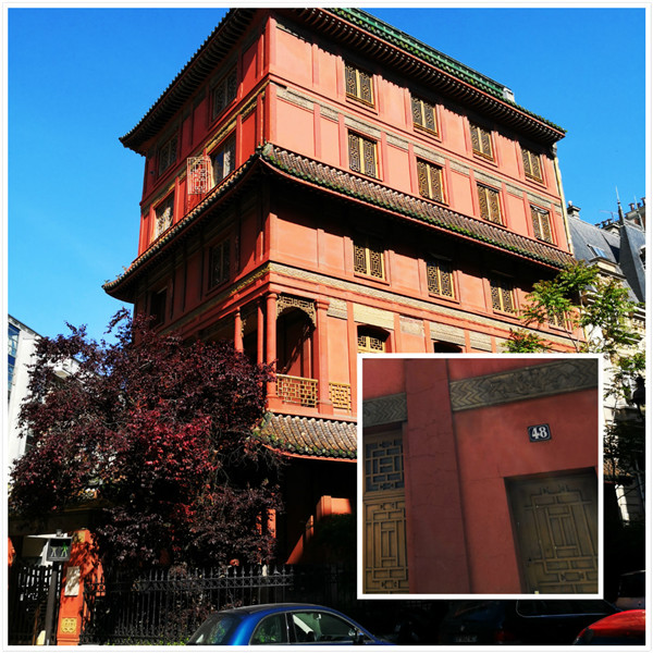 果然转进去的这条路就叫库尔塞勒街,走过一个弧度,但见前方斜十字路口耸立着一幢鲜明东方特色的五层古红色小楼房,在四周香槟色的法式建筑中格外醒目,就是它了——库尔塞勒街48号的“巴黎红楼”。巴黎友人告诉我们,在法国旅游书籍中叫“中国塔”。