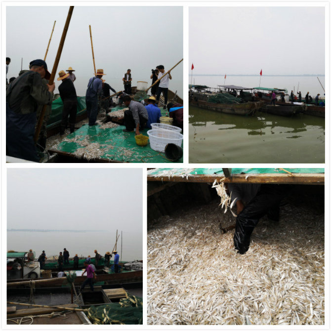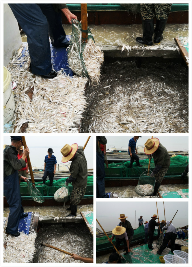 我们乘坐的游船往北又向西急速行驶,在白浪翻滚中离湖岸线越来越远。约半个小时左右,到达指定的水域,看到了已经收网的四条渔船。从登上捕鱼船开始,小伙伴包括我自己,相机、摄像机、航拍机和手机就不停地咔嚓。在两船之间的水面是百米直径的超大渔网,最左边两艘渔船是收鱼船。我们走上这条渔船之后,发现这张大网中基本上都是小鱼,多是鲚鱼,偶尔也有一些白鱼、银鱼、白虾和少量大一点的鱼。