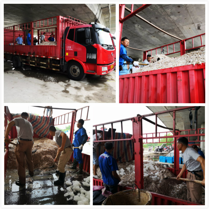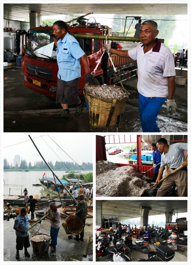 靠岸后,小伙伴们担心素材不够,就主动自我加压,来到渔市采访。长兜港大桥下的渔市规模不算大,条件也不是很完善。但见三四艘渔船已经靠岸,一筐筐的鲚鱼正被抬上江苏、安徽和本省牌照的红色大型卡车,也有特地赶来的路人在与鱼贩交易。