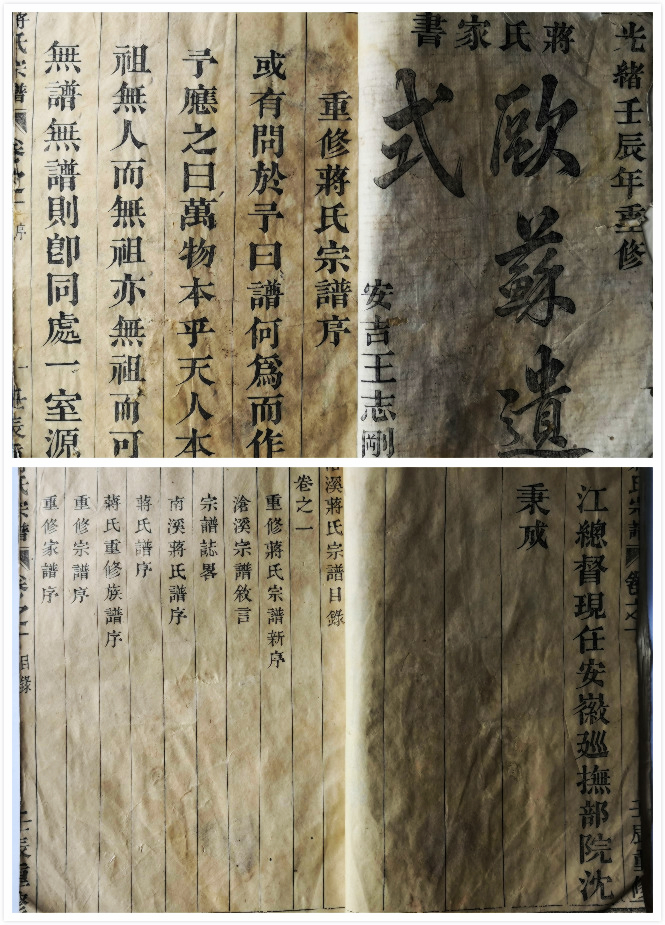 过去,祖父母、父母亲常给我们讲中国的习俗、讲乡下的故事。长大后明白,在以自然经济为基础的农村,人们聚族而居、聚族成村,是一个传承了数千年的传统。随着经济社会发展步伐的加快,这种聚族而居的传统才逐渐被打破,或将渐渐消散。对于三代居住城里的人,我对家族本没有太深的感知,只是随着年龄的增长,才偶尔阅览一下那部残破的明朝万历二十六年(1598)始修、清朝光绪十八年(1892)重修、民国十五年(1926)又修的《苕溪蒋氏宗谱》,也称《沧溪蒋氏宗谱》《南苕蒋氏宗谱》。好奇地关心一下类似名讳辈派的脉络和直系的名、字、号、生平等,让我稍许知道了始祖迁徙到西苕溪南岸以来历代先人的生活轨迹和耕读作为。