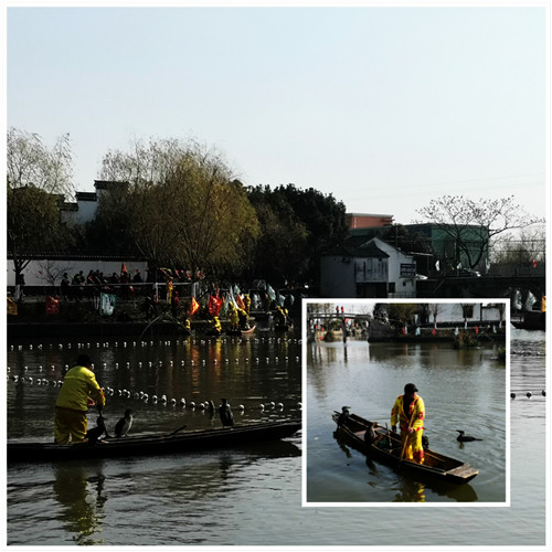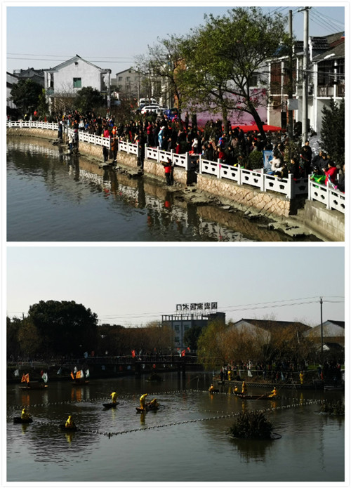 村民家门口和道路两边,镇上多家饭店以鱼为主题,设置了精品餐点摊位,汇聚成一道迎丰收、晒丰收、庆丰收的嘉年华。游人和村民早早地围在河漾四边。河面上,渔民划着小船,拉紧渔网慢慢提起,活蹦乱跳的鱼儿差点要冲出渔网重回水中;还有渔鹰在助兴,但见渔民举篙轻抹一下渔鹰的脚边,它们便扑扑钻入水中,不一会便喉囊鼓鼓地跳上船,渔民熟练地拎住它的脖子,把一条条鱼挤出来,众人不由地鼓掌欢呼。