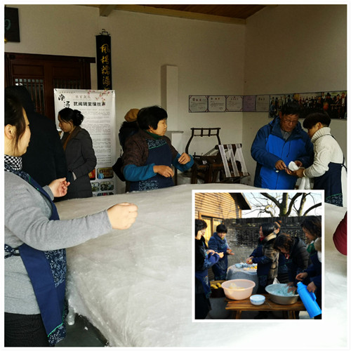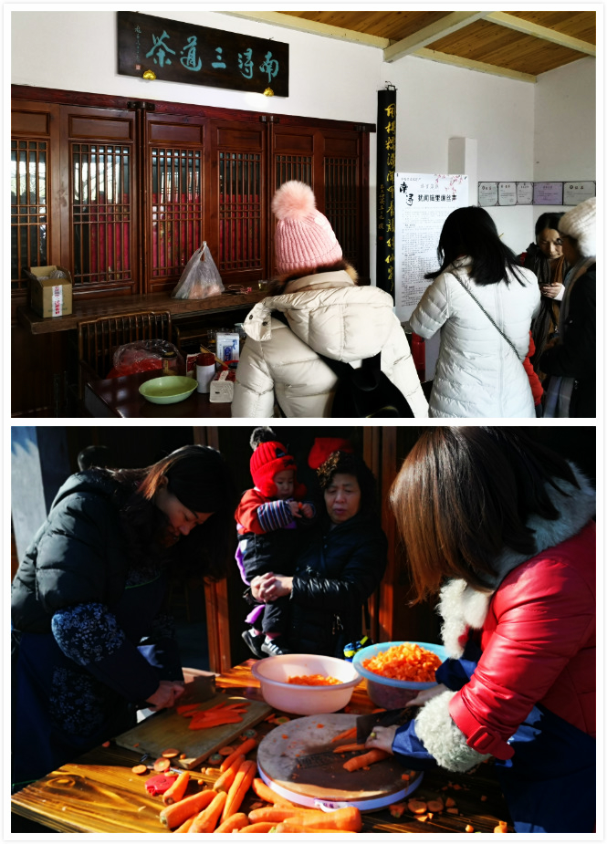 随着游人往北走去,小路两边尽是浓浓的乡愁。这里在演绎“三道茶”,廊檐下,几个村嫂切着丁香萝卜;屋内,村姑在为客人冲泡“三道茶”,这是江南地区的传统土特产品,农家待客素有自制和饮用此茶的习俗,据说是太湖传统风味之一绝。“三道茶”分为甜茶、咸茶、清茶,是因为这三种茶要一起用来招待贵客的。目前许多地方还保留着这一待客习俗,特别是用“三道茶”来作为“毛脚女婿"首次登门的礼仪,也就是说,“毛脚女婿”喝了甜蜜的锅糍茶、咸味的熏豆茶和清淡的绿茶,就算过了丈人丈母家这一关了。春节期间,几乎家家户户都会不约而同地把“三道茶”作为招待亲友的首选饮品。不管大人小孩去别人家串门,主人一定会请客人喝“三道茶”。怪不得南浔人常说,“三道茶”犹如人生百味,有甜有咸也有淡。“三道茶”的背后可见南浔人的热情、风雅、乐观与真诚朴实。