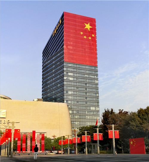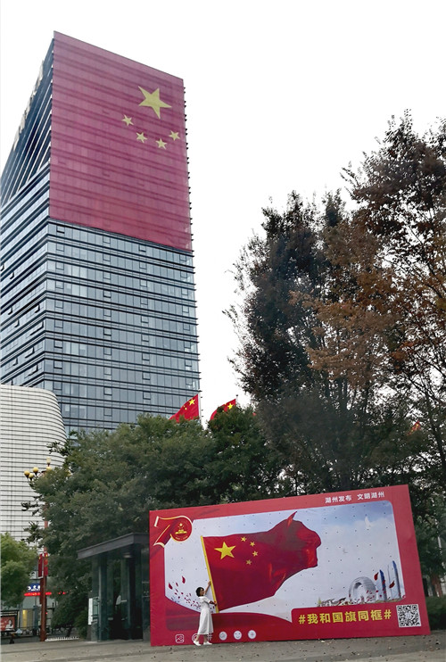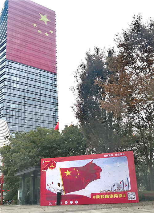 国庆70周年前夕的一天,我途经湖城爱山广场,抬头往西一看,对面近三十层的浙北大厦热闹非凡,从顶端往下正在竖挂一面宽度遮住山墙、目测高度有十二层楼的巨幅国旗。后来问了业内人士,国旗的具体尺寸是29米乘以46米。